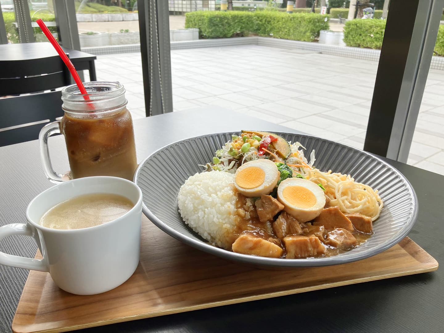 ランチメニューは日替わりランチをはじめ、定番の「チキン南蛮ランチ」や「サラダランチ」、「さかなランチ」などがあり、バリエーションが豊富なお料理が楽しめます。一面ガラス張りの明るい空間で尼崎記念公園の緑を眺めながら食事を楽しめるのもポイントです。
